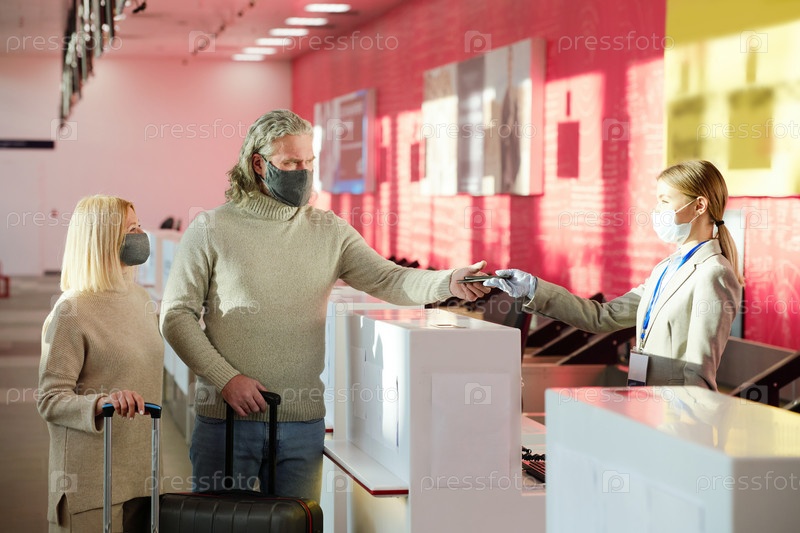Зрелая пара в повседневной одежде и защитных масках возвращает свои паспорта после регистрации