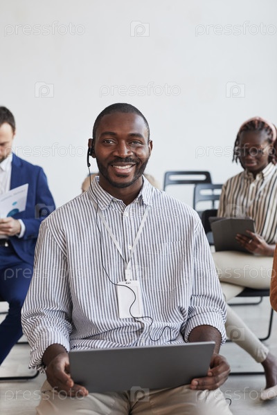 Улыбающийся афроамериканский бизнесмен в аудитории