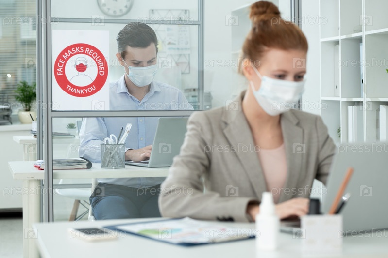 Элегантный мужчина в защитной маске общается в сети в офисе перед коллегой
