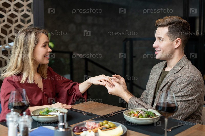 Счастливый элегантный молодой человек надевает обручальное кольцо на палец своей девушки