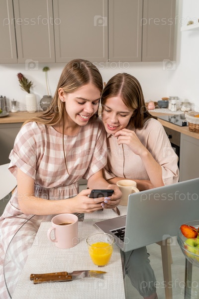 Одна из девочек-близнецов показывает сестре любопытное видео на смартфоне