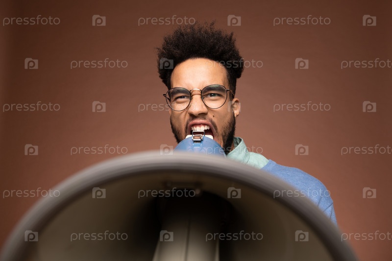 Молодой разгневанный бизнесмен или босс в очках, громко кричащий на мегафоне