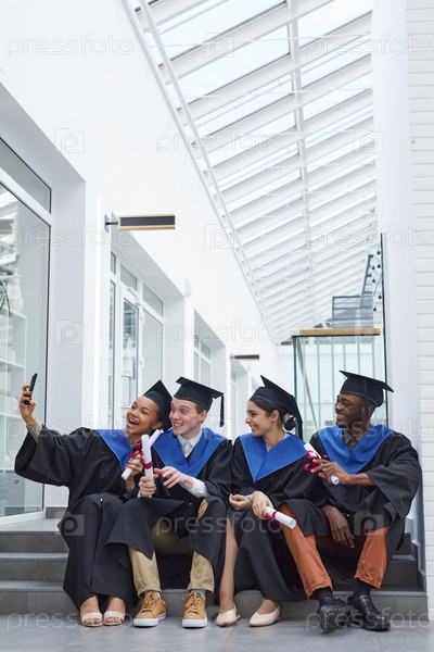 Разнообразная группа выпускников колледжей делают селфи на свежем воздухе