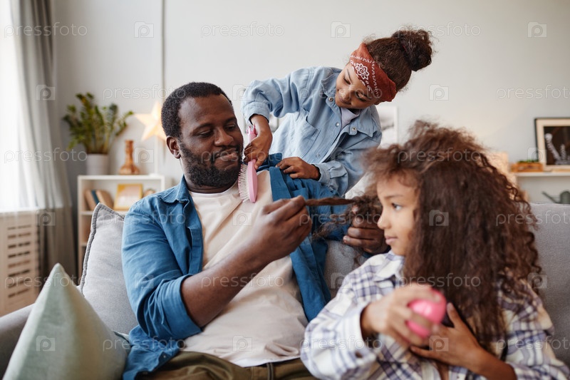 Отец вяжет волосы девочек