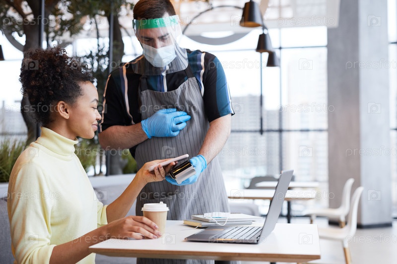 Молодая женщина платит в кафе