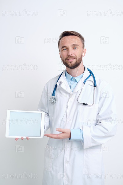 Молодой врач-мужчина в белом халате и наушниках делает презентацию новой вакцины