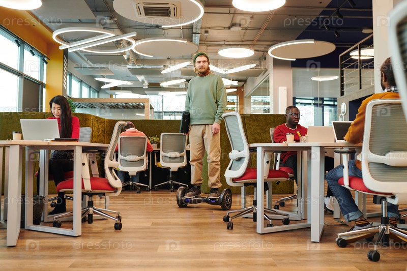 Бородатый офисный менеджер держит велосипед, перемещаясь между столами коллег