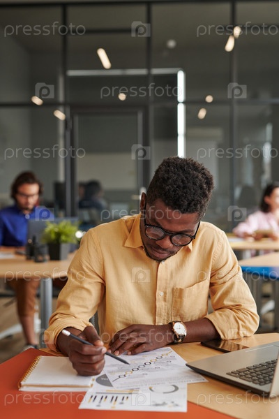 Загруженный афроамериканский бизнесмен анализирующий график