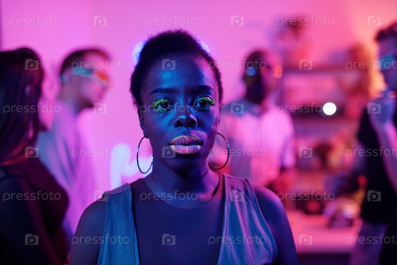 Счастливая молодая гламурная женщина африканской этнической принадлежности, держащая глаза закрытыми