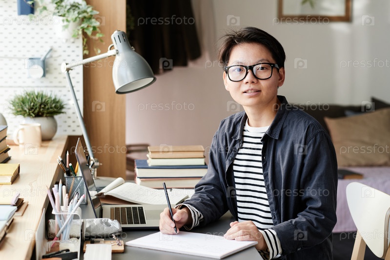 Портрет содержимого Азиатский мальчик в рубашке и очках сидит за столом с лампой и ноутбуком и рисует на эскиз-паде, работая над дизайнерским проектом