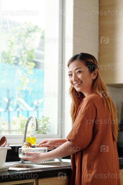 Улыбающаяся женщина моет посуду