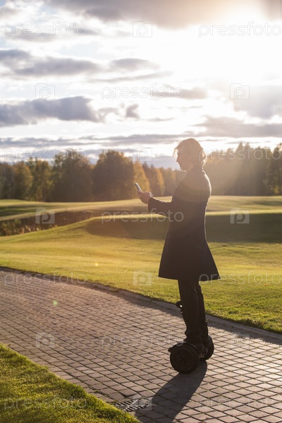 Описание бизнесмена, делающего селфи, стоя на гироскопе в солнечный день