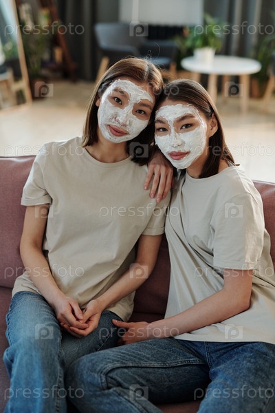 Две молодые ласковые брюнетки с глиняной маской на лицах сидят на диване