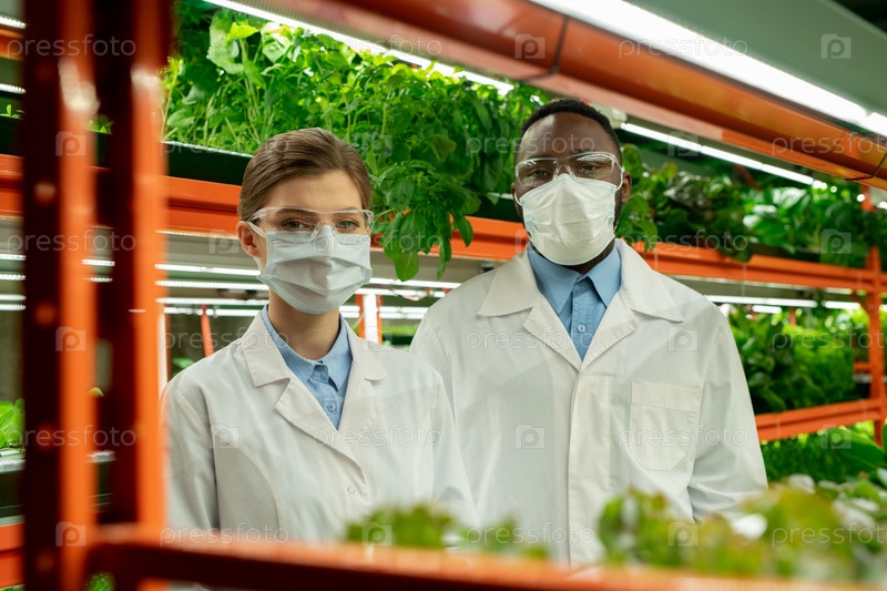 Многоэтнические работники теплиц в масках и белых пальто