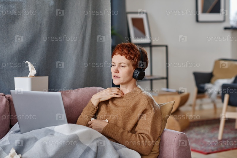 Горизонтальный снимок зрелой женщины с гриппом, сидящей дома на диване и имеющей онлайн-запись к врачу