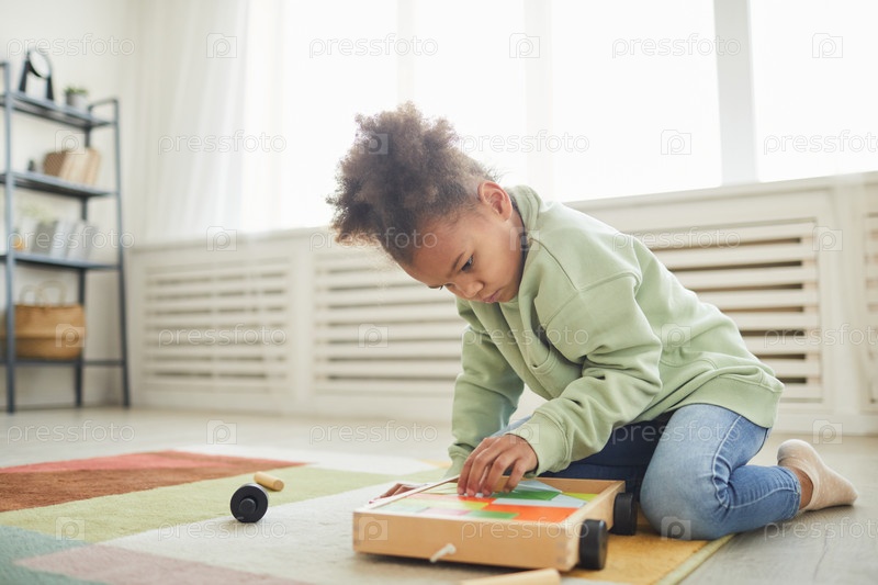 Афроамериканская девочка играет с игрушками на полу