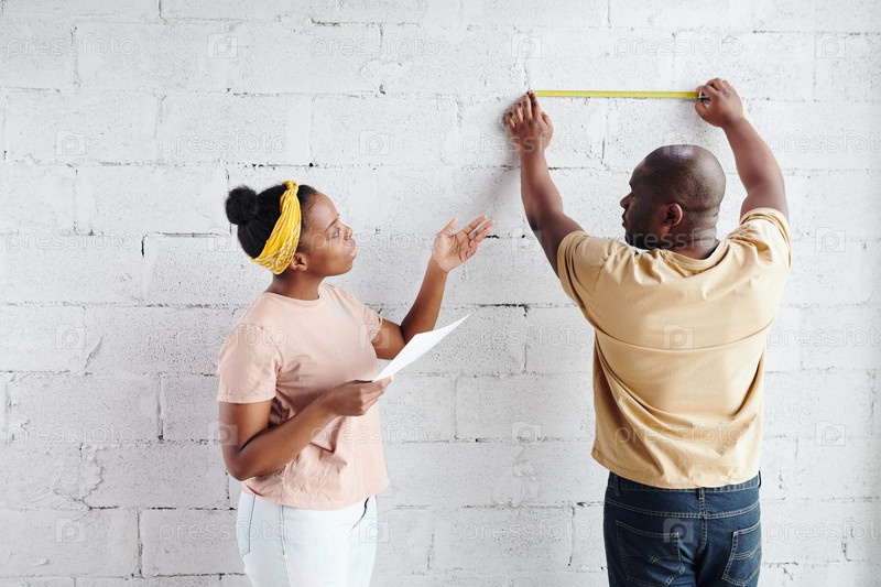 Молодая африканская женщина с бумагой стоит рядом со своим мужем, измеряющим длину стеновых кирпичей