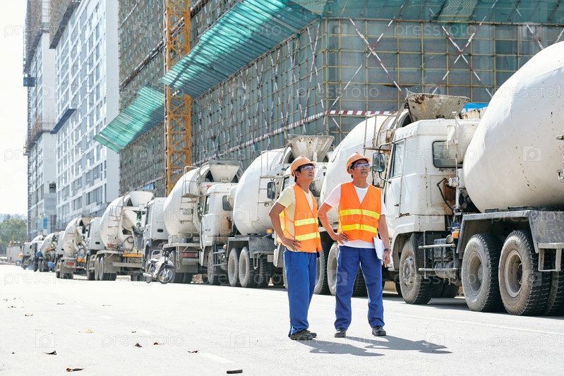 Строительные рабочие стоят у припаркованных грузовиков