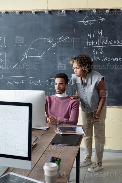 Двое молодых бирациальных коллег смотрят на компьютерный экран