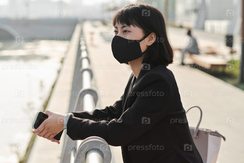 Маскированная женщина смотрит в сторону азиатский
