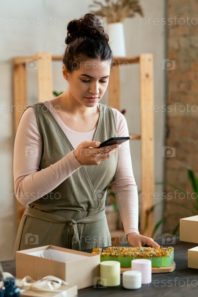 Молодая женщина с смартфоном снимает свежее ароматическое ручное мыло