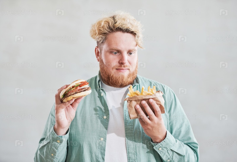 Мужчина ест фаст-фуд