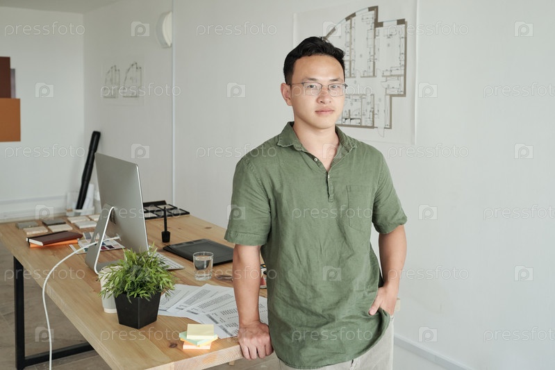 Молодой уверенный бизнесмен азиатской этнической принадлежности стоит на рабочем месте