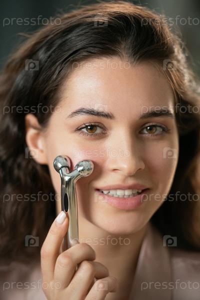 Красивая молодая брюнетка использует металлический массажный ролик на своем лице