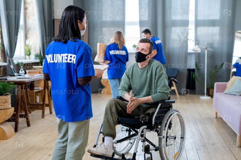 Молодой инвалид в инвалидном кресле взаимодействует с азиатской волонтеркой