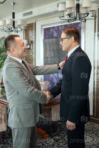 Счастливый зрелый бизнесмен приветствует иностранного партнера рукопожатием после переговоров