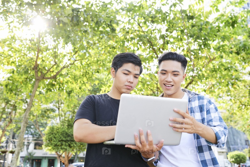 Подростки, использующие ноутбук на улице