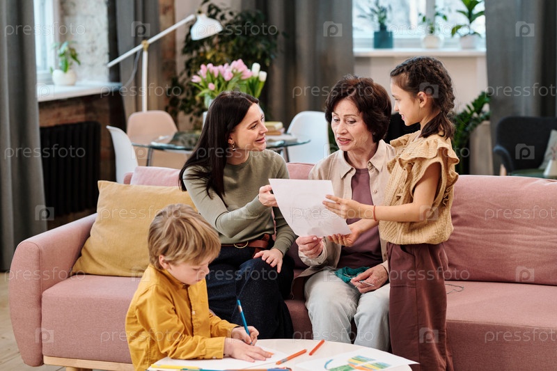 Милая девочка, показывающая свои рисунки маме и бабушке