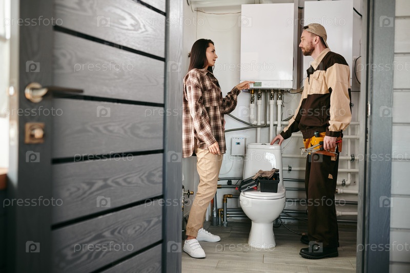 Мужчина и женщина, стоящие в ванной комнате и обсуждающие проблему с сантехническим оборудованием