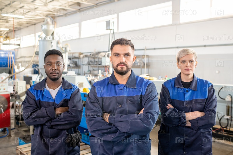 Трое молодых межкультурных рабочих современного завода в комбинезонах, стоящих против промышленных машин
