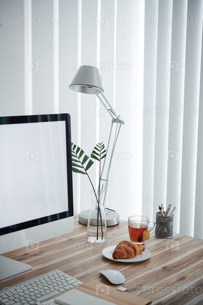 Чай и кроассан рядом с компьютером на столе