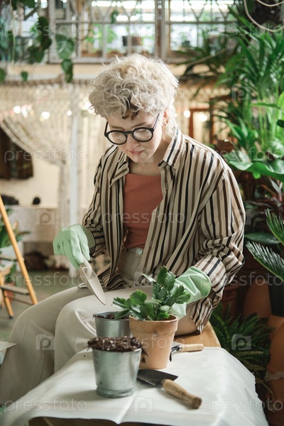 Женщина сажает растения в горшках