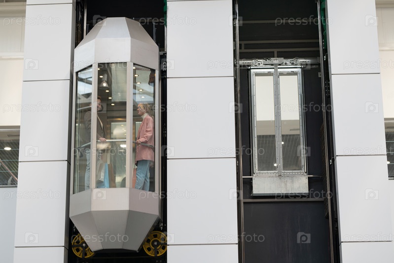 Человек, стоящий в лифте внутри большого торгового центра