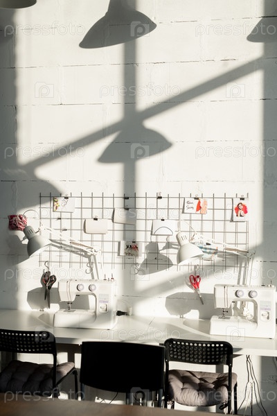 Рабочее место современного портного или швеи с столом со лампами, швейными машинами и другими