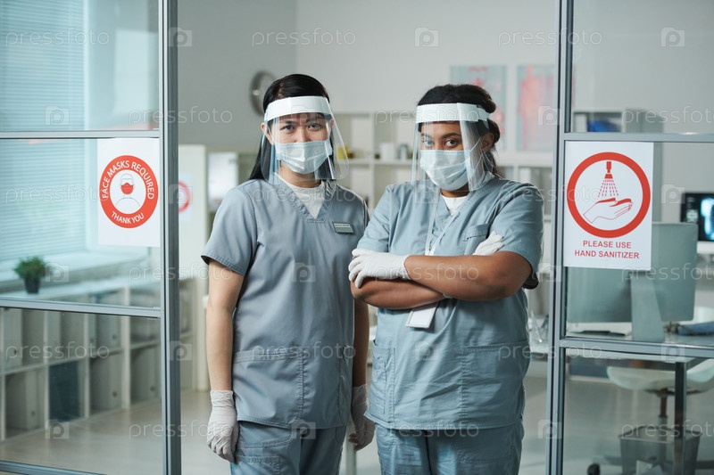 Две молодые межкультурные женщины-клиницистки в защитной рабочей одежде стоят в медицинском кабинете