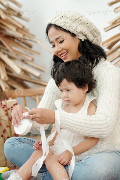 Мать и дочь разворачивают ленту