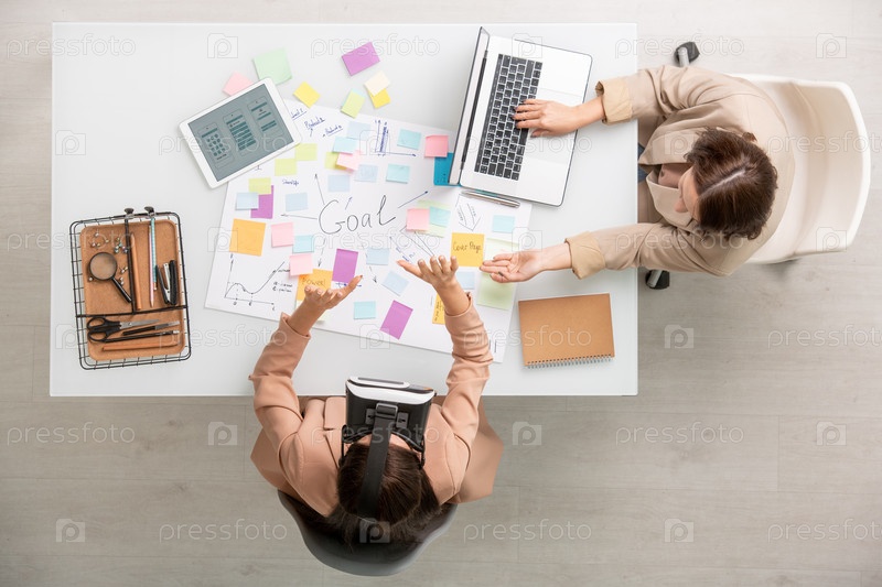 Молодая бизнес-женщина с ноутбуком обсуждает заметки со своим коллегой в VR гарнитуре