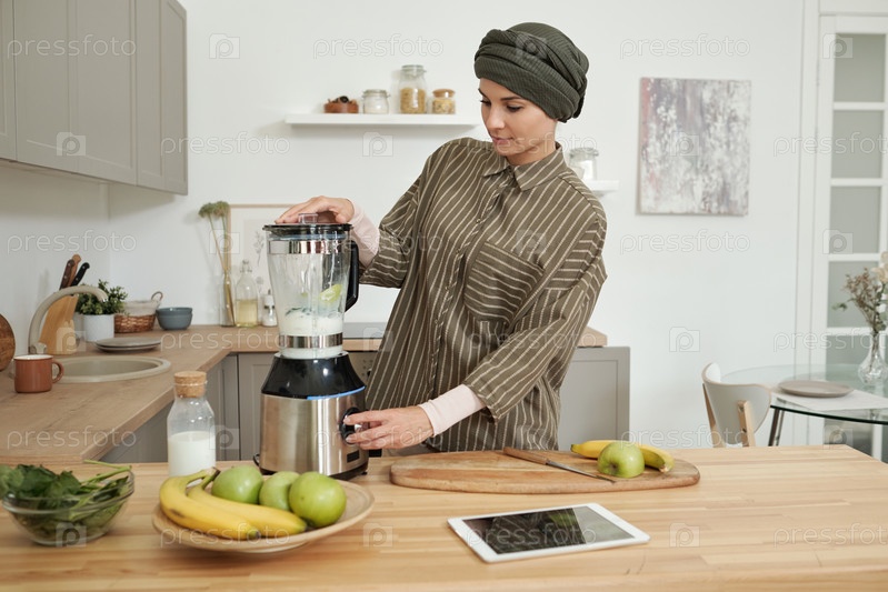 Молодая женщина готовит свежий фруктовый смузи в блендере