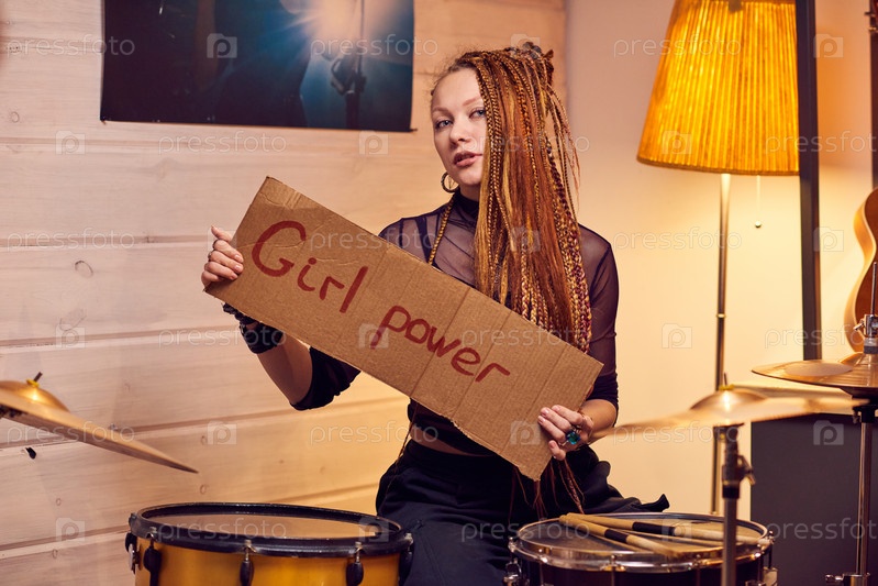 Девушка с плакатом в студии