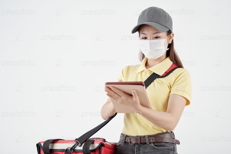 Женщина-курьер в медицинской маске