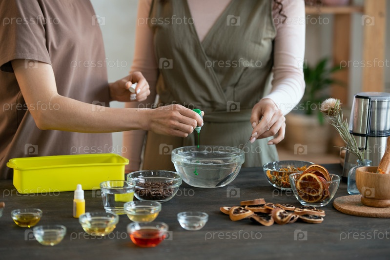 Молодая самка наливает жидкий зеленый краситель в миску с расплавленной массой мыла