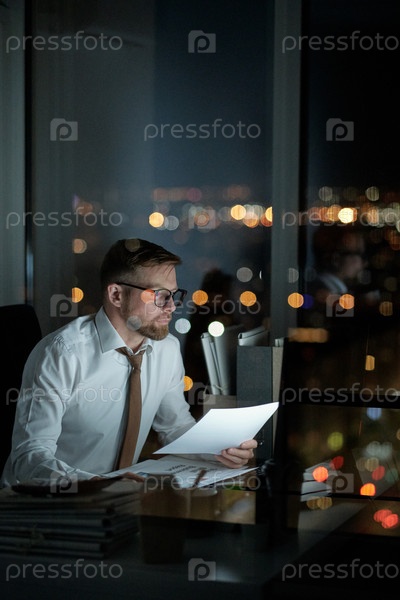 Молодой экономист с бумажной сетью перед компьютером