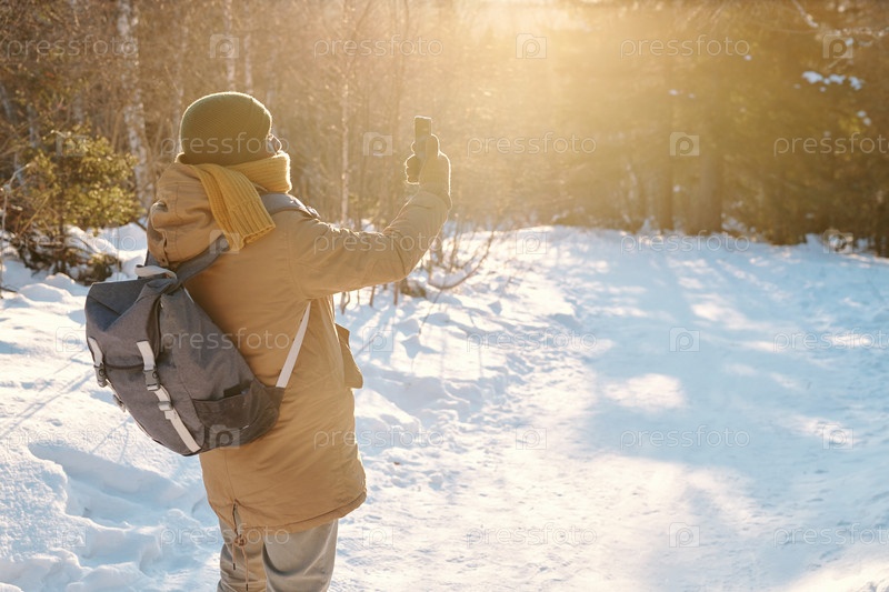 Молодая африканская рюкзачница в зимней одежде делает селфи