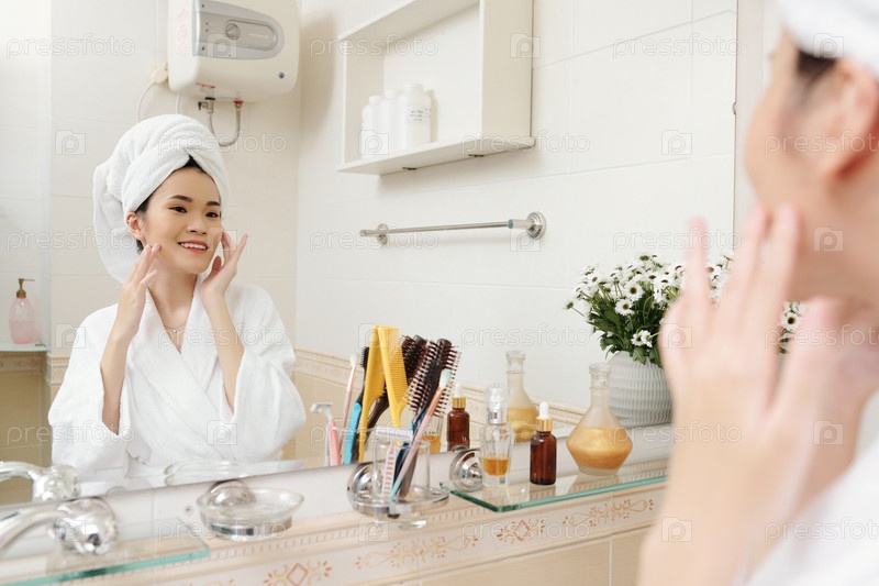 Женщина наносит лосьоны для лица
