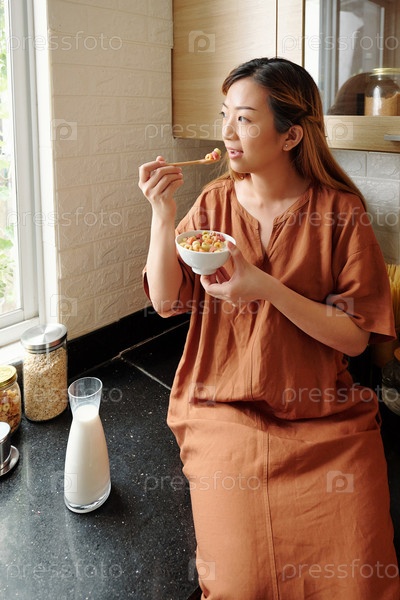 Женщина ест миску с хлопьями