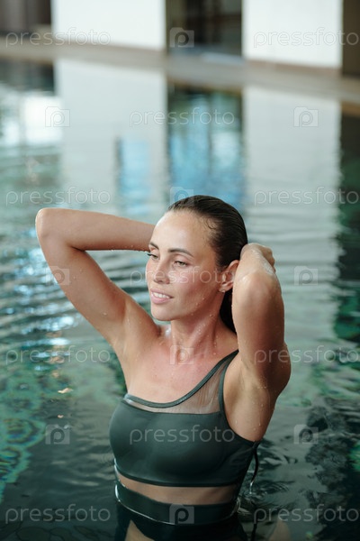 Счастливая женщина, стоящая в воде бассейна